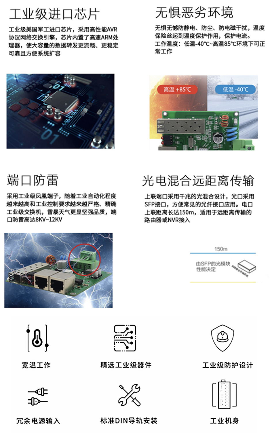 工業級(NT品牌)非網管1百光2百電,SFP接口,導軌式-DC12~52V供電-寬溫(-40℃-85℃)。默認不含AC電源適配器和不含光模塊。 |
