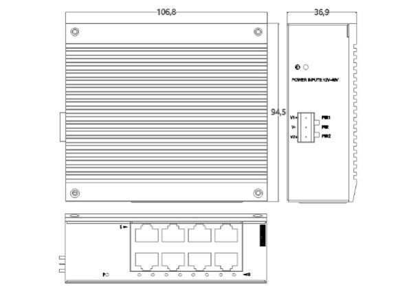 外殼:金屬材質 安裝:DIN 卡軌式,壁掛式安裝 重量:0.25Kg 尺寸 :106.8 x 94.5 x 36.9mm(長 x 寬 x 高) |