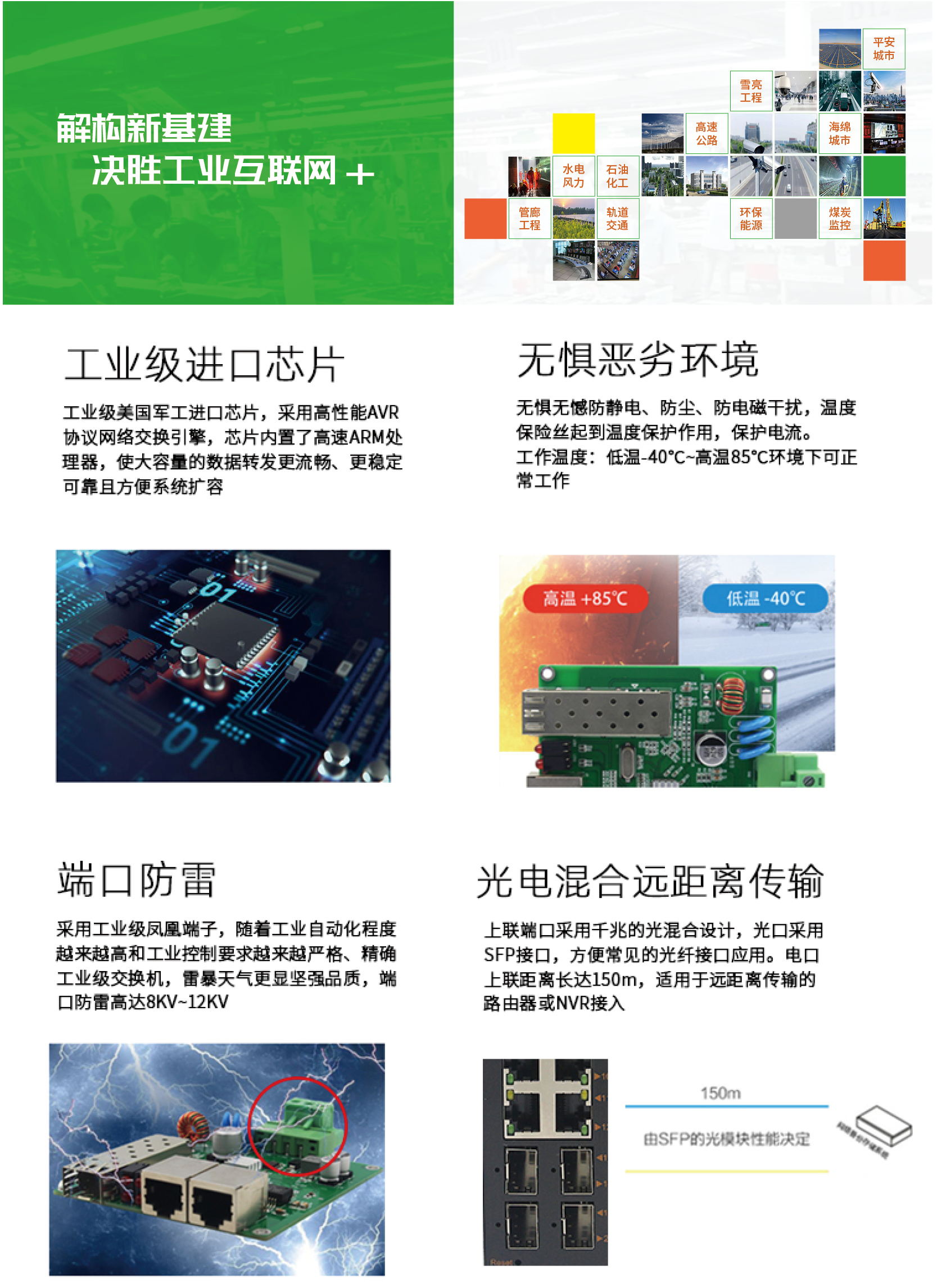 | 采用工業(yè)級(jí)元器件,具有防雷、防過壓、防浪涌設(shè)計(jì),雙電源輸入,保證在不良自然天氣及電壓不穩(wěn)環(huán)境下網(wǎng)絡(luò)的正常運(yùn)行。 | |